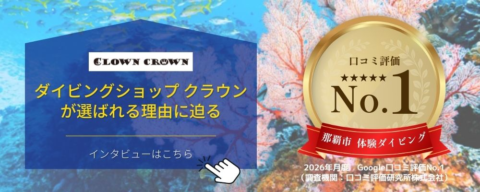 那覇市のダイビングショップ「クラウンクラウン」では、初心者向けの体験ダイビングからPADIライセンス取得コースまで幅広く対応。経験豊富なインストラクターが少人数制でサポートするため、初めての方も安心です。